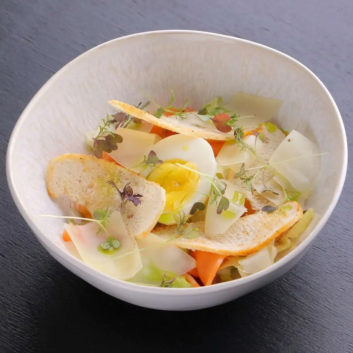 Лёгкий и освежающий салат с ярким вкусом. Хрустящие листья салата, сочные апельсин и грейпфрут, а также свежий огурец создают текстуру и свежесть. Нежные креветки добавляют мягкий вкус, а хрустящий сельдерей и тыквенные семечки привносят разнообразие в текстуру. Заправка на основе соуса понзу объединяет все ингредиенты в гармоничное блюдо.